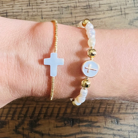 Pearl and gold cross bracelet