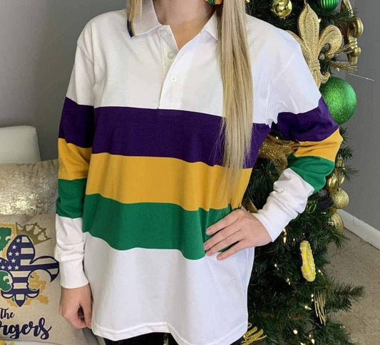 Adult Mardi Gras Polo Shirt (White, LS) # 287: Large