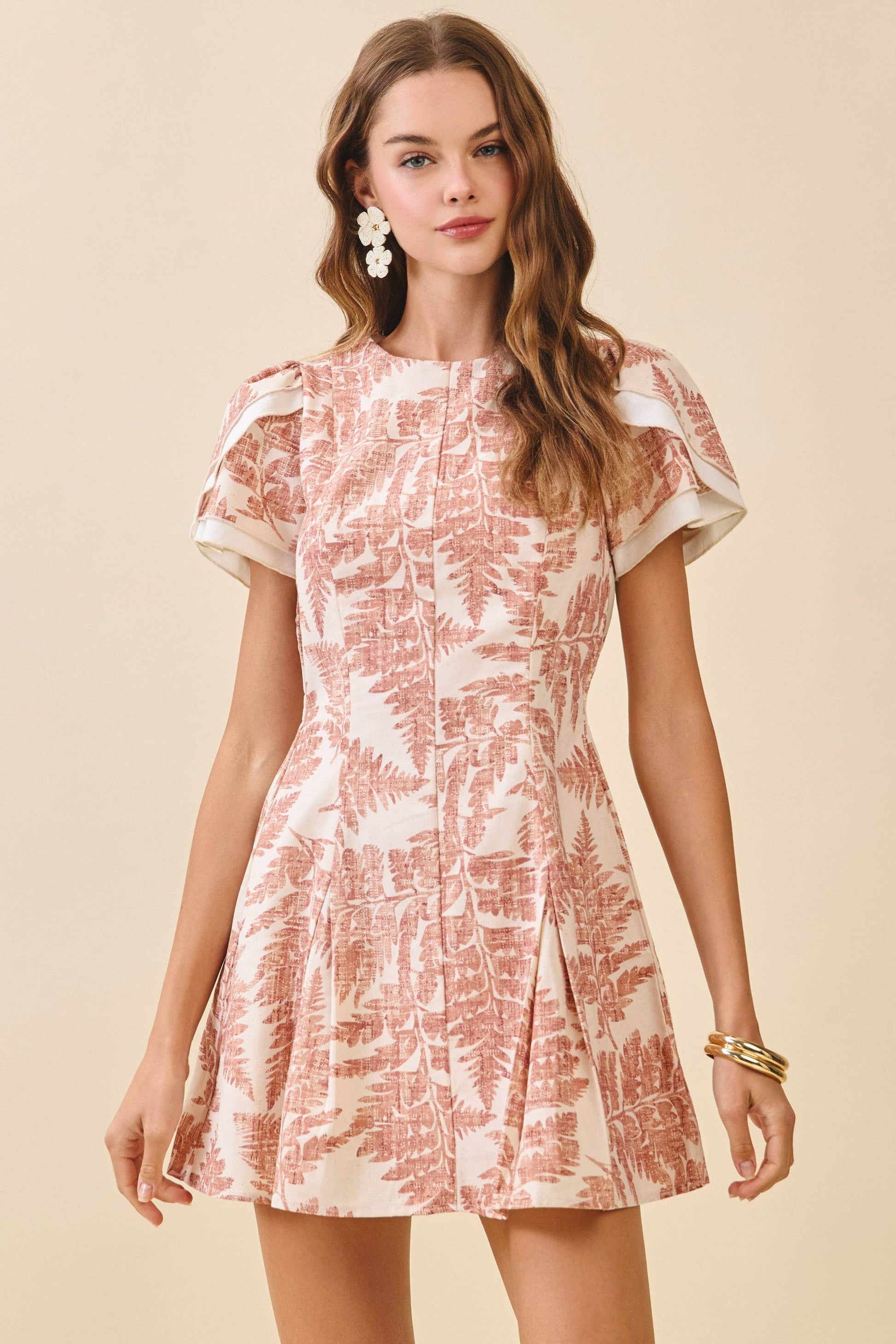 Mini dress featuring a rust fern print, short puff sleeves with contrast cuffs, a round neckline, and seam detailing. Designed with a fitted waist, back gathers, and a pleated flared hem. Finished with a back hidden zipper.