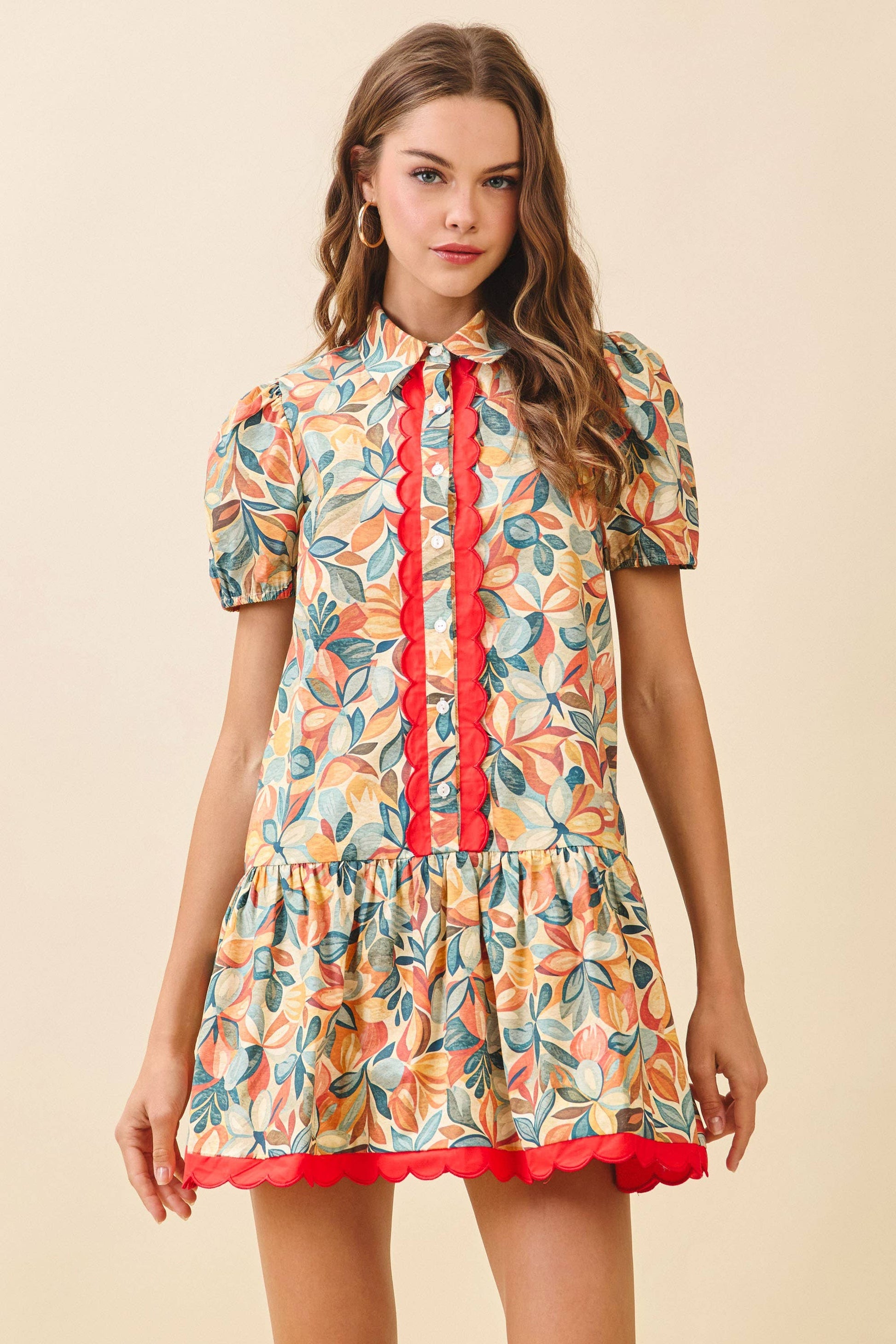Floral print mini dress featuring a collared neckline, puff sleeves, and a front button placket with contrast scallop trim. Designed with a drop-waist silhouette and a scalloped hem with bold contrast detail.