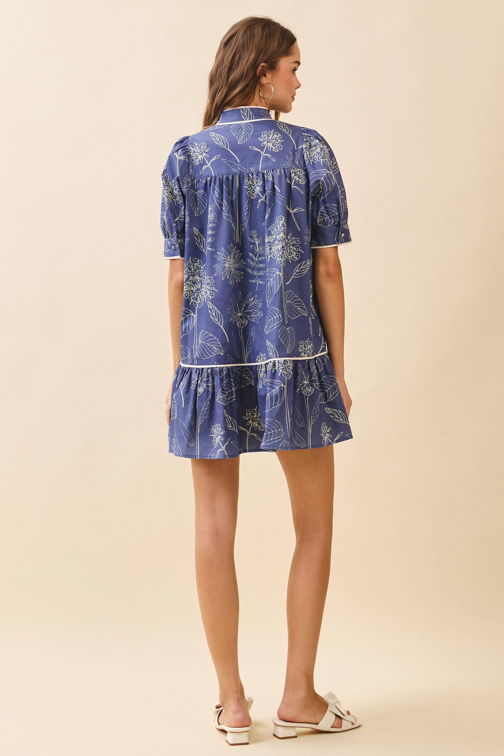 Floral print mini dress featuring a high band collar with front button placket and contrast piping trim. Designed with short puff sleeves, a relaxed shift silhouette, and a drop-waist ruffle hem for a playful finish.