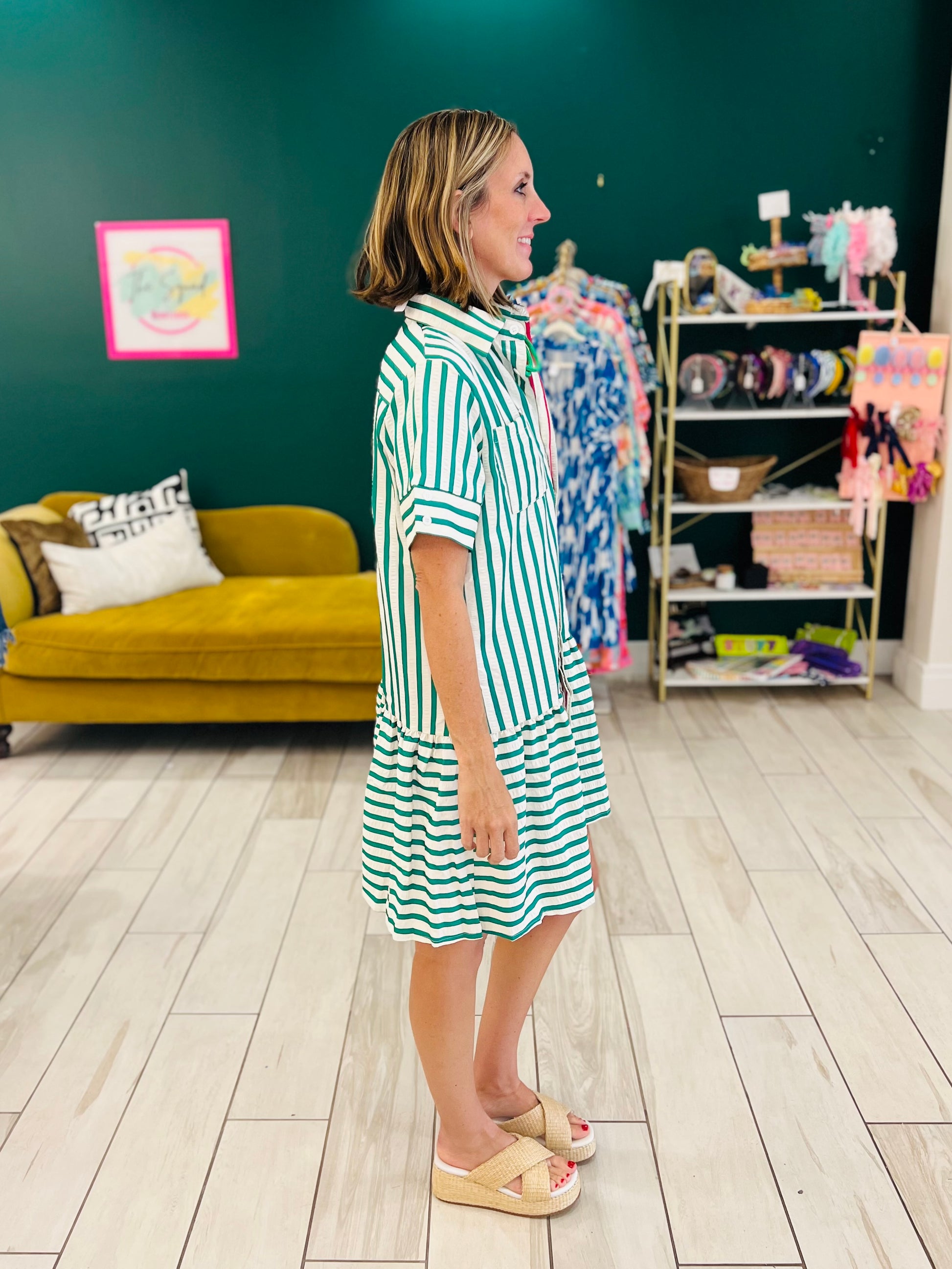 The prettiest textured dress with green and white striped, a pop of color with hot pink trim inside of the hidden buttons, cute buttons on sleeves. Looser fit.