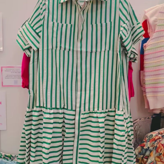 Textured button down green stripe dress with hot pink trim