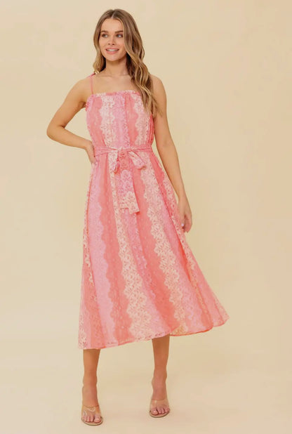 Gorgeous lace dress with coral pink and cream woven meticulously to make a masterpiece.